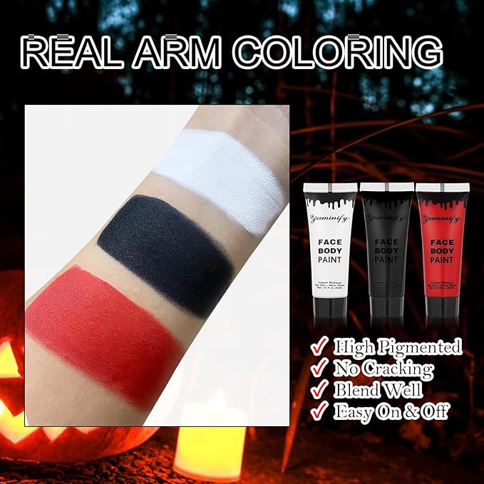 - HIGH PIGMENT & EASY TO BLEND:Paminify Black and white face paint kit provides intense pigmentation for full coverage. Its smooth, creamy texture blends effortlessly with a brush, sponge, or fingertips,ensuring seamless application without cracking or fading for halloween makeup
