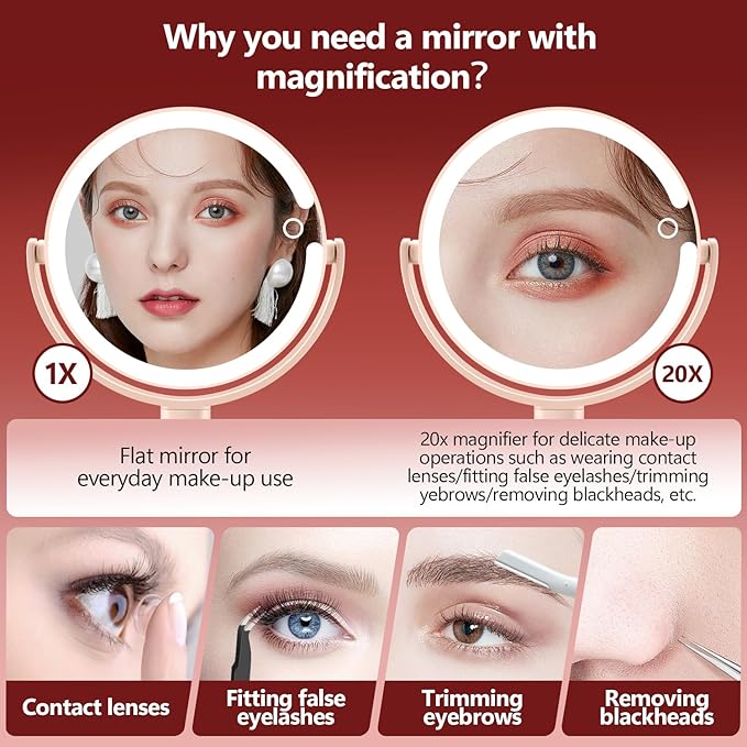- Dual Side 1x/20x Magnifying Lighted Mirror: This magnifying makeup mirror comes with 1X and 20X mirror, the 1X is suitable for daily use and the 20x magnifying mirror is suitable for delicate operations such as eyelash plucking, eye lash installation, wearing contact lenses,and removing blackheads, it's not only suitable for young women, but also the first choice of makeup mirrors for seniors and cataract patients