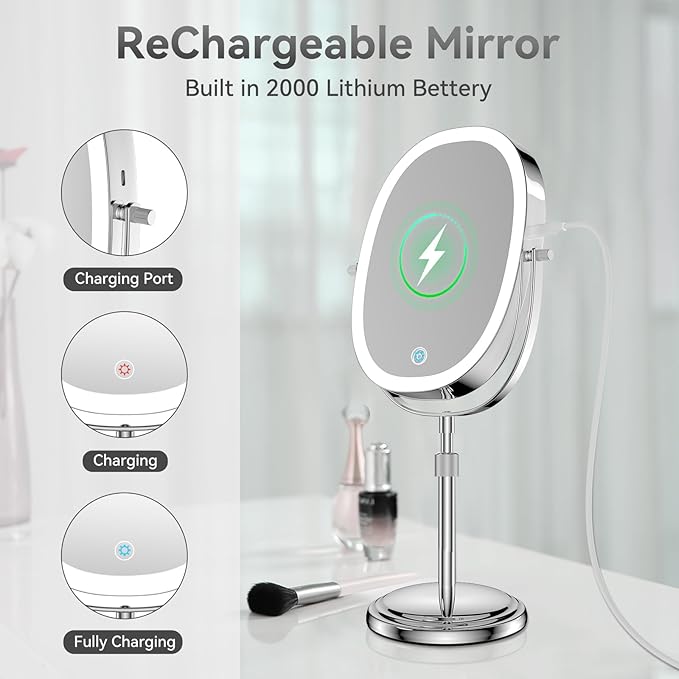 DOWRY Lighted Makeup Mirror with 7X Magnification, Height Adjustable Vanity Mirror, Rechargeable 3 Color Lights Lighted Makeup Mirror, 360° Swivel Double Sided Magnifying Mirror