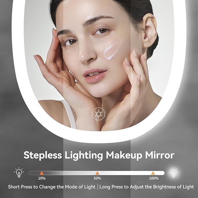 - 3 Color Lights and Stepless Brightness The lighted makeup mirror provides white light, warm light, cold light, meeting the needs of various lighting conditions. White light can be used for daily office makeup; warm light creates a soft glow for evening look; natural light simulates daylight. The soft light can cover all corners of your face. Short press the sensor switch to change the color of the light, long press to adjust the brightness of the light to meet all your needs in different environments.