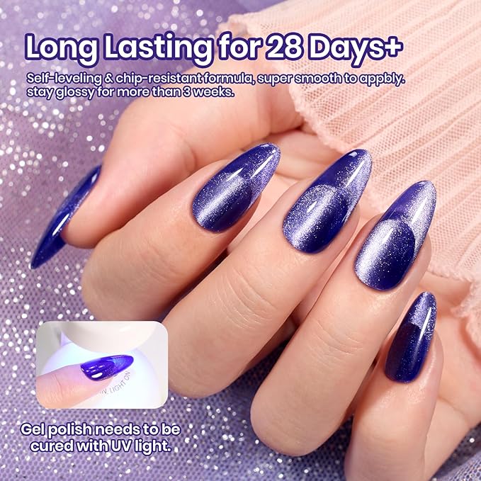 - 【Speed Curing with Uv/Led Lamp】The holographic glitter purple cat eye gel polish needs to be cured under the uv/led light. The average time for uv/led lights is 60-120 secs. It remains sticky after curing and must be used with a base coat and top coat! (Note:This item does not include a base&top coat, which needs to be purchased separately)Tips: Gently shake well before use—especially for metallic, glitter, and cat eye gel nail polish—to evenly mix natural settling of pigment particles.