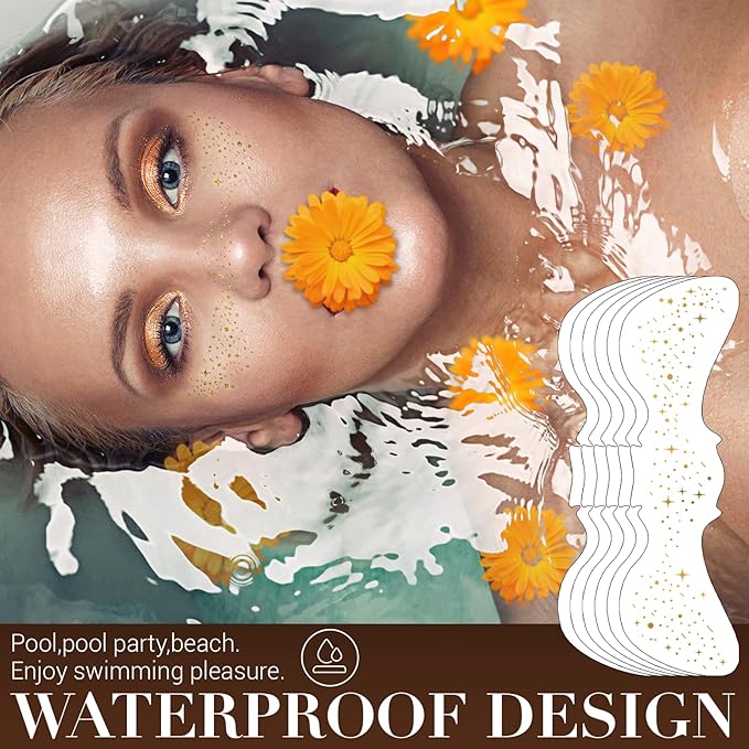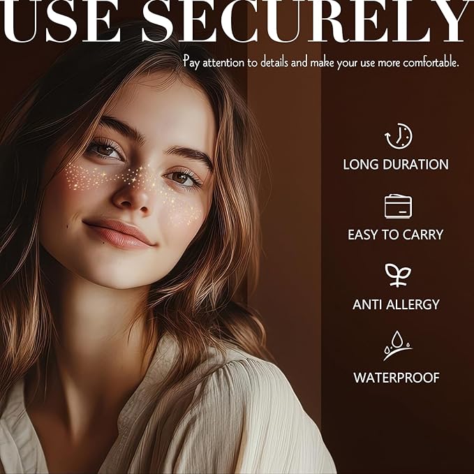 - 【Waterproof & Sweatproof】Long-lasting Performance: Engineered for durability, our golden glitter freckles face tattoo is designed to withstand water and sweat, ensuring your look remains flawless throughout long nights out, intense photoshoots, or sunny beach days. Ideal for summer parties, weddings, and beach outings where gold glitter adds a luxurious finish.