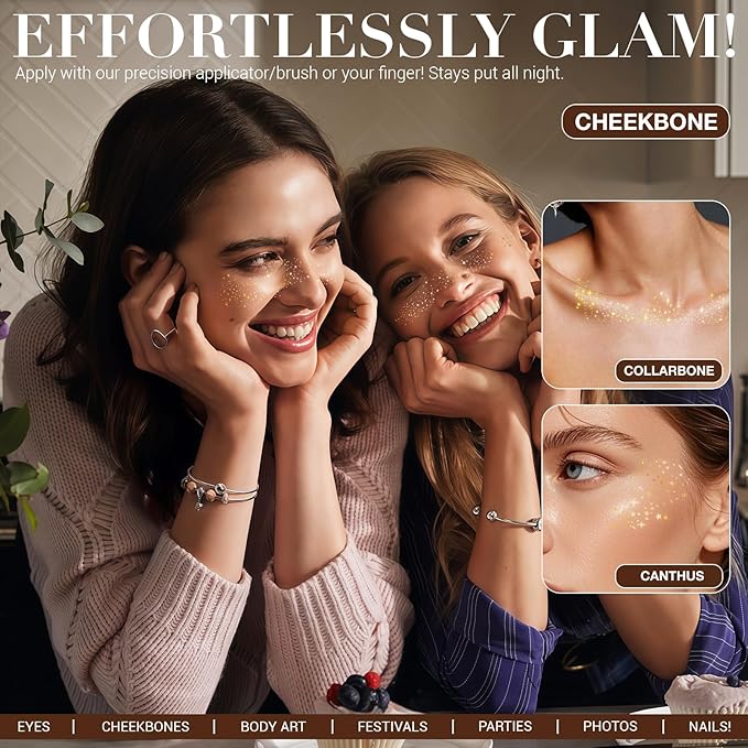 - 【Versatile Use】Adaptable to Every Occasion: From enhancing everyday makeup routines to adding flair during music festivals, beach parties, and other celebratory moments, these versatile glitter freckles adapt seamlessly to various styles and settings. Perfect for complementing metallic dresses or gold-themed events, they provide the perfect finishing touch.