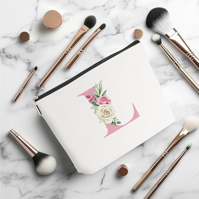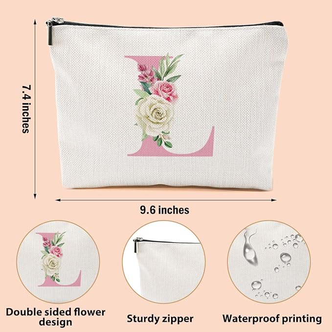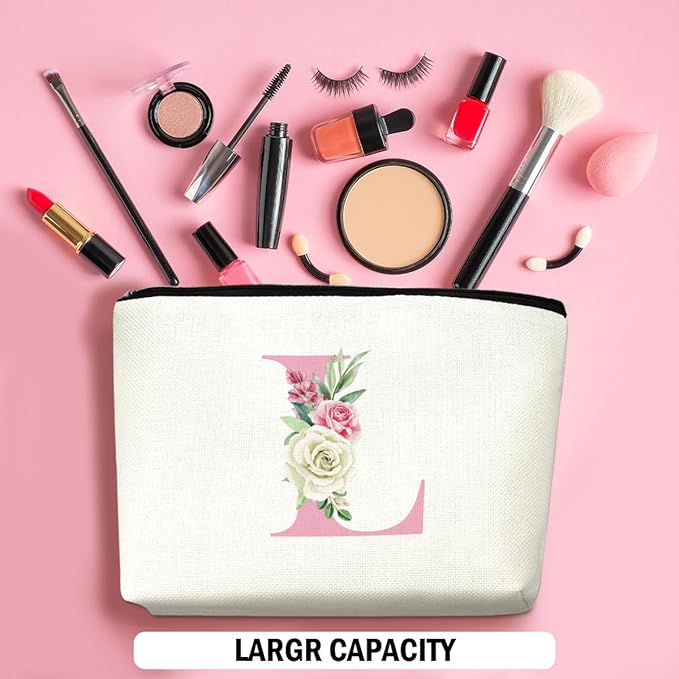 Pink Monogram Makeup Bag, Initial L, Cosmetic Bag Personalized Travel Organizer Bags Makeup Pouch, Monogrammed Gifts for Women Girls Friend Sisters Bestie Bridesmaid Wedding Bridal Shower Gifts