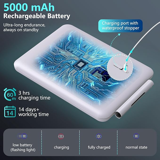 - Rechargeable: Built-in 5000 mAh rechargeable lithium battery, the shaving mirror for shower fogless can be used continuously for 2-4 weeks after a single charge. Blue indicator light blinks when the battery is low, please charge in time (including charging cable, excluding charger).