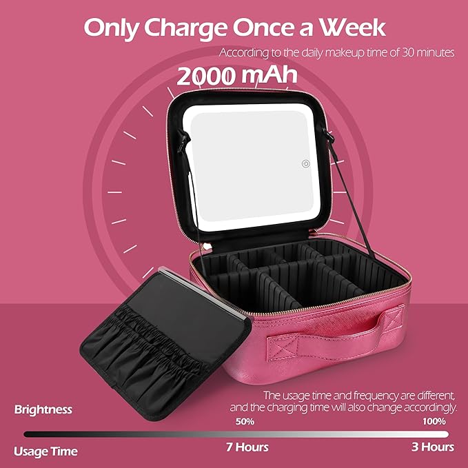 MOMIRA Travel Makeup Bag Cosmetic Bag Makeup Organizer Bag with Lighted Mirror, Adjustable Brightness in 3 Color Scenarios, Waterproof Makeup Train Case, Gift for Women - Brilliant Rose