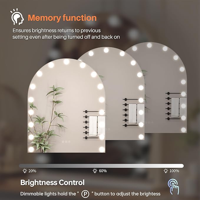 - 【Smart Touch Control】The touch sensor switch on this makeup mirror with lights allows for easy on/off functionality and precise brightness adjustments. The memory function retains your last brightness setting, ensuring that the mirror will resume to your preferred level when powered on again.