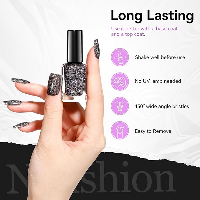 - Black Rainbow Glitter Air Dry Nail Polish: Nailshion black glitter nail polish provides salon-quality coverage and a glossy shine. With just two layers, plus a base and top coat, it sparkles like rainbow diamonds—perfect for parties. Available in trendy black glitter shades, it's a must-have for making a statement at any event.