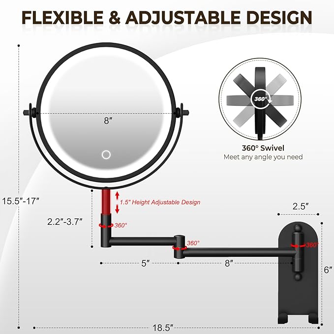 - â¨ăHeight Adjustable Extension Armăâ The height of the bathroom vanity mirror is adjustable from 15.5" to 17" to meet varying height requirements; âĄ360°free rotation allows you to effortlessly find your desired angle; ⢠The wall mounted mirror with 13" extendable arm can be adjusted to any position you need to achieve perfect viewing. The cosmetic mirror has passed over 20,000 times fatigue test, proved the durability and stability of the rotating shaft.