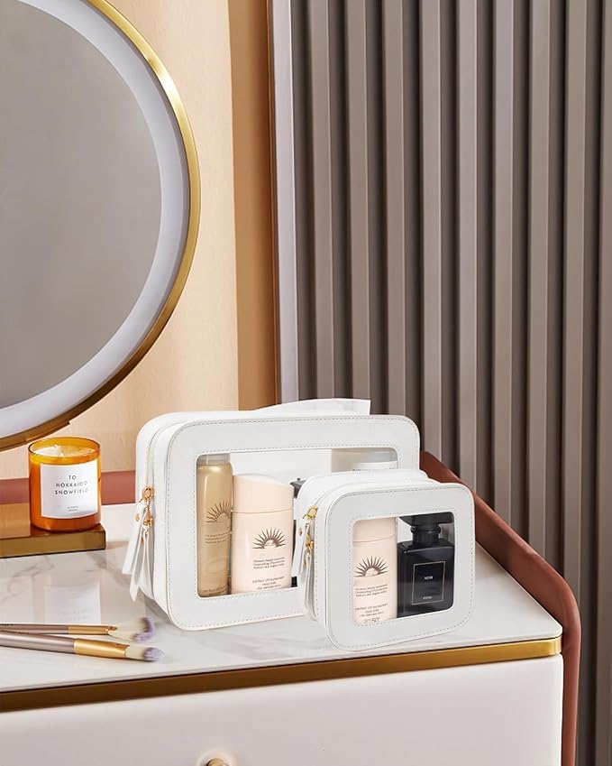 2 Pcs Travel Clear Makeup Bag Set, Clear White Makeup Organizer with Zipper Leather Travel Bags for Toiletries Small Cosmetic Bags for Women Mini Make up Pouch Toiletry Bags Car Essentials