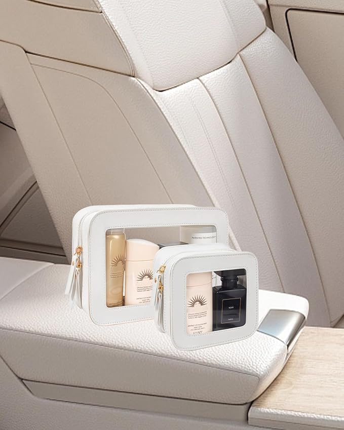 - Car Must Have Essential: Our large and small travel toiletry bag is roomy to store your makeup brushes, lipstick, eyebrow pencil, make-up foundation,skin care, cables, chargersor and other little items.It make your daily make-up, cream, lipstick, perfume and other beauty things organized and protected.This clear mini toiletry bag can be a good car accessory fits in the center console or other parts of your car