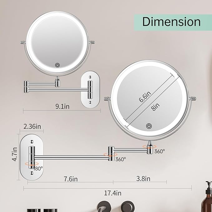 - ๐ก๐๐๐ยฐ ๐๐จ๐ญ๐๐ญ๐ข๐จ๐ง & ๐๐ฑ๐ญ๐๐ง๐๐๐๐ฅ๐ ๐๐ซ๐ฆ:The lighted makeup mirror with magnification is mounted on the wall, designed with a extendable arm. 360 degree free rotation provides you with a comfortable viewing angle when putting on makeup, shaving or wearing contact lenses. It can be folded against the wall to save space when not in use