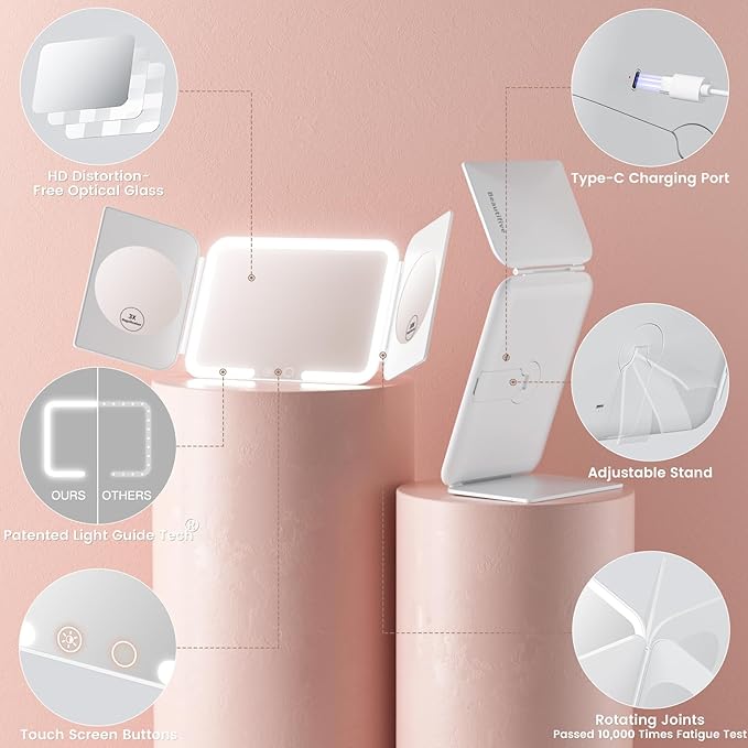 Trifold Travel Lighted Makeup Mirror, 5000mAh Rechargeable Light Up Magnifying Mirrors 1X/3X/10X, 3 Color Lighting&Stepless Dimming, Ultra Bright and Multi-Angle Adjustment