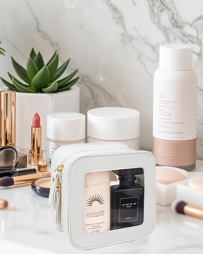 2 Pcs Travel Clear Makeup Bag Set, Clear White Makeup Organizer with Zipper Leather Travel Bags for Toiletries Small Cosmetic Bags for Women Mini Make up Pouch Toiletry Bags Car Essentials