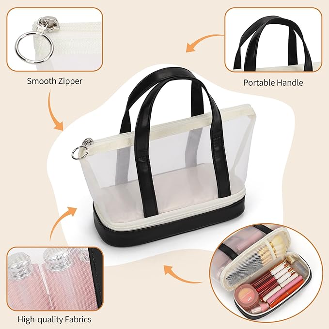 - Functionality and Practicality: The bag has two zip compartments.The main compartment is a soft, see-through mesh, making it easy to see the contents, has a thick plastic vinyl base, ideal for storing moist or dusty items and easy to clean.The bottom inner compartment includes a mesh pocket for extra storage.The bottom outside is made of soft pseudo-leather, which feels nice to the touch.