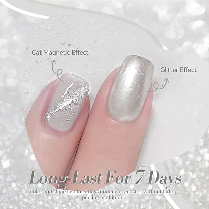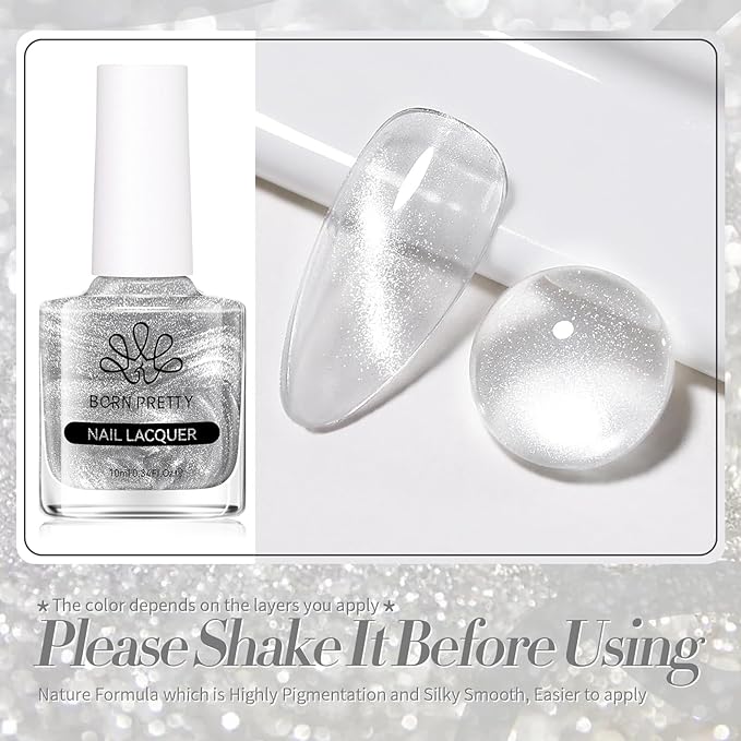 Born Pretty Cat Magnetic Eye Nail Polish, Silver Platinum Moonlight Quick Dry Sparkle Shimmer Glitter Nail Polish with Magnet 10ML