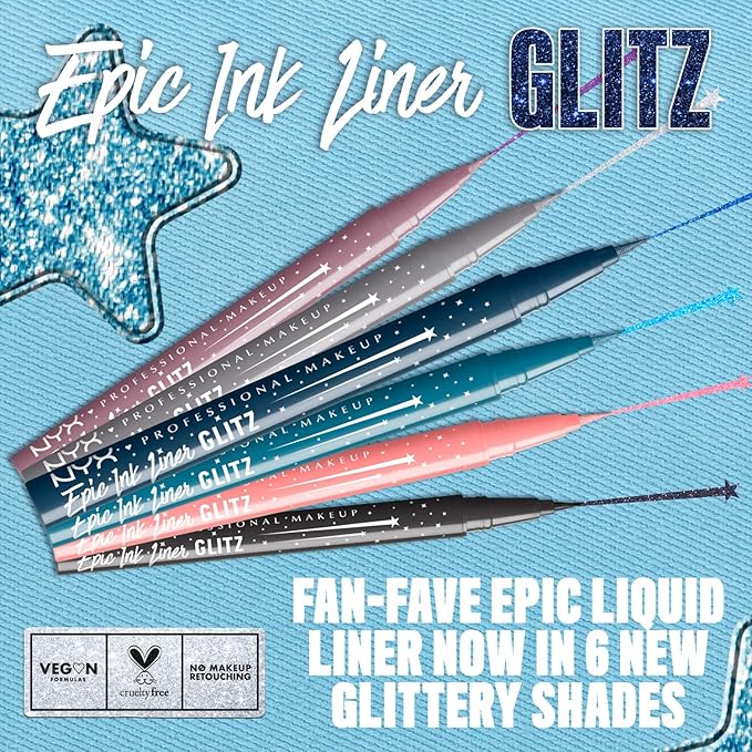 - Waterproof Glitter Eyeliner: Our Epic family just got even more epic with this highly-reflective glitter eye liner for saturated lines that last. Now in 6 new glitzy shades - this epic glitz hits