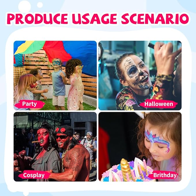 - 【No skill required and save time】:Hold the stencil firmly on skin and apply face paint either by using sponge or airbrush.For Sponge,Simply load your sponge with some face paint. Make sure your sponge is almost completely dry so that the paint doesn't bleed under the stencil. Pat gently making sure not to press too hard and lift the stencil carefully. For airbrush,spray it from at least two inches away in low pressure at a 90 degree angle from the stencil to avoid paint going under the stencil