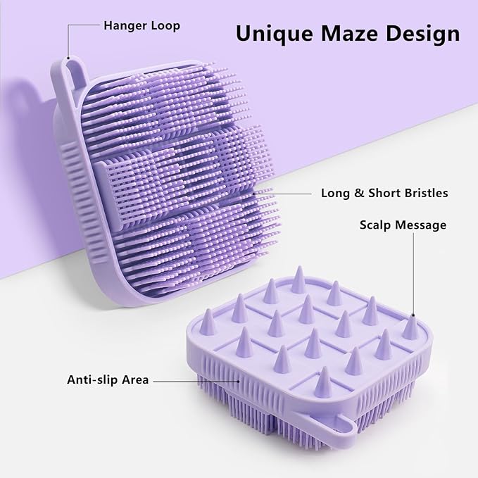 - Dual-Sided Bathing Brush: Mabnuby Silicone Shower Scrubber for body features 2 sides sud scrub - soft long bristles for body massager & cone brush for scalp hair massage scrub. The Advanced intensive bristles are not easy to deform, daily skin care.