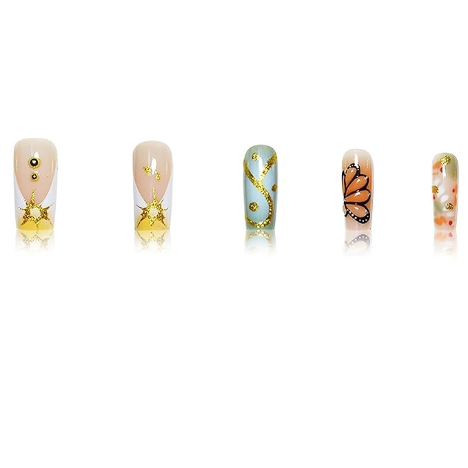 RUOKEXIN Long Square Press on Nails French Tip Fake Nails Gold Glitter False Nails with 3D Butterfly Designs Long Glue on Nails Sparkly Artificial Nails Cute Stick on Nails for Women 24Pcs