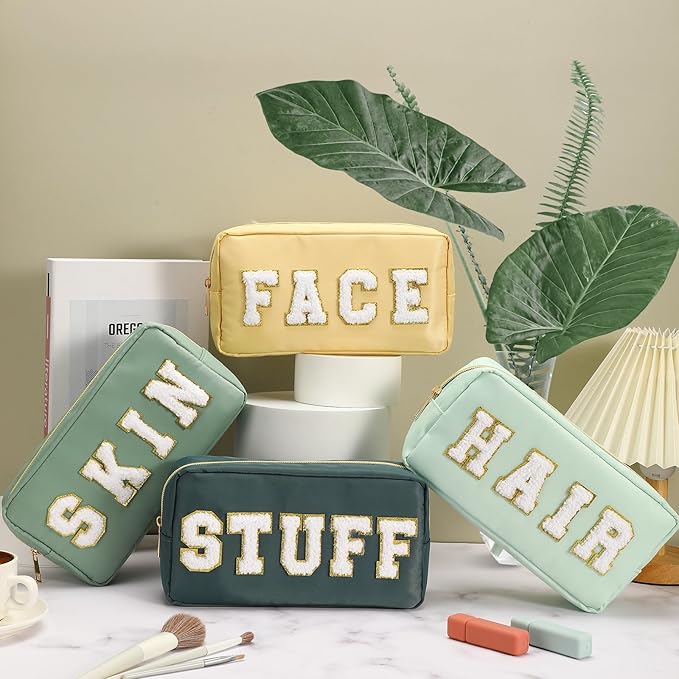 Cunno 4 Pcs Preppy Makeup Bags Chenille Letter Stuff Bag Nylon Cosmetic Pouch Cases with Zipper for Women Travel Toiletry