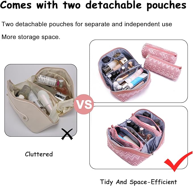 - 3 Pcs Makeup Bags Set: This travel cosmetic bags set comes with two detachable zipper small bags. Five precision-crafted compartments keep skincare and cosmetics flawlessly sorted, designed for seamless transitions between travel, business trips, outdoor adventures, and leisure escapes.