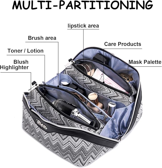 - Travel Makeup Bag with Compartments: An excellent leather waterproof cosmetic bag is perfect for any setting - whether on your dresser, in the bathroom, outdoors, in the car, on the train, or packed in your luggage. It keeps your makeup organized and easily accessible, so you can meet your beauty needs anytime, anywhere.