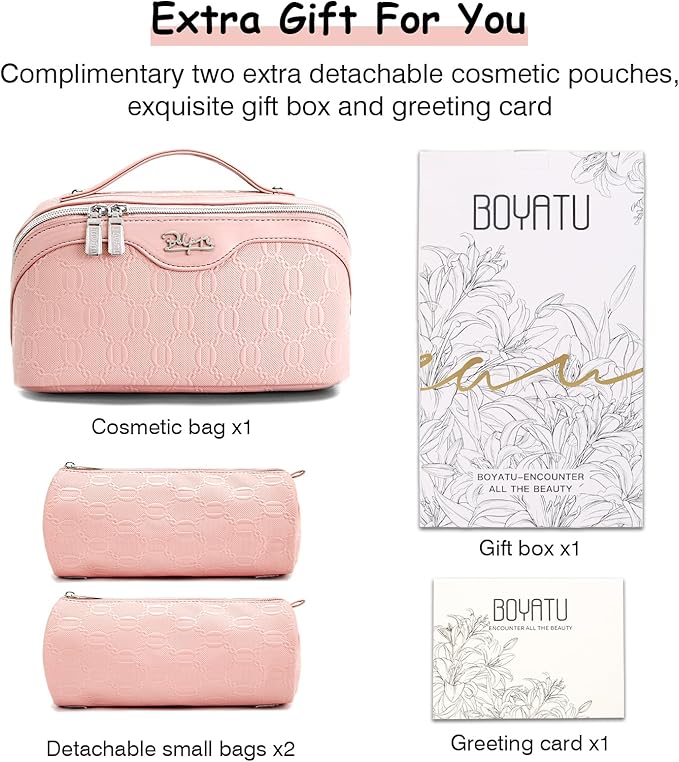 - Travel Makeup Bags for Women: This women's cosmetic bag is made of high-quality PU leather, soft to the touch, waterproof and durable. Elegant appearance design will bring you countless awesome compliments. BOYATU portable travel cosmetic bag is a great choice and ideal companion for you.