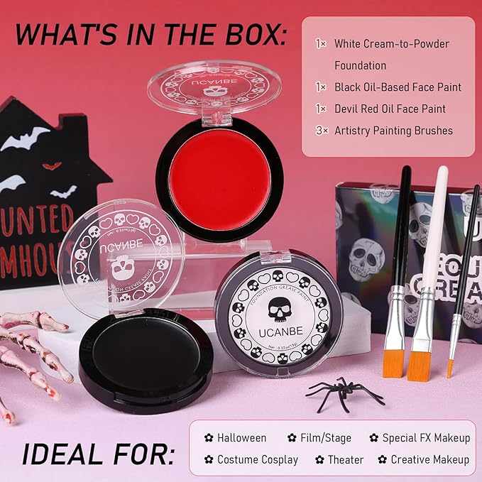 - 【White-Black-Red Face Body Paint Cream Makeup for Daily & Halloween】UCANBE face paint kit contains 3 colors professional face paints with 3pcs painting brushes. The white foundation face makeup paint is specially crafted with cream-to-powder formula that glides on like cream yet settles down to a matte finish. The black and red face paints, with silky texture, are oil-based cream makeup paints that goes on smoothly and easy to blend and layer for flawless opaque makeup. UCANBE White Pressed Setting Powder is highly recommended to set makeup quickly and last all day long