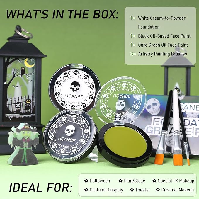 - Included Components : White Cream-to-Powder Foundation+Black Cream Face Paint+Ogre Green Cream Face Paint+3Pcs Pro Painting Brushes White Cream-to-Powder Foundation+Black Cream Face Paint+Ogre Green Cream Face Paint+3Pcs Pro Painting Brushes