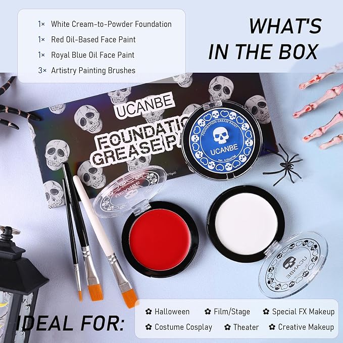 - 【Variety Uses for Different Popular Characters】White foundation makeup paint combined with black and blue face paints & 3 paintbrushes, safe and non-toxic for people of all ages, adults and kids, starters and pro-painters, to create marvelous face & body artistic or spooky paintings on different occasions such as school stage, prom, cosplay conferences, theatrical performances, themed costume parties, films or movie sets, sports games(usually used as eye black or national flag painting) and more