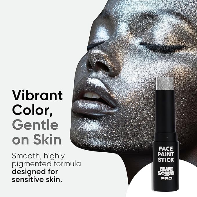 Blue Squid PRO Metallic Silver Face Paint Stick - Waterproof Silver Body Paint Adults & Kids Eye Black Baseball, Eyeblack Softball -Hypoallergenic Twist-Up Non-Toxic Makeup Stick Cosplay, Sports & SFX
