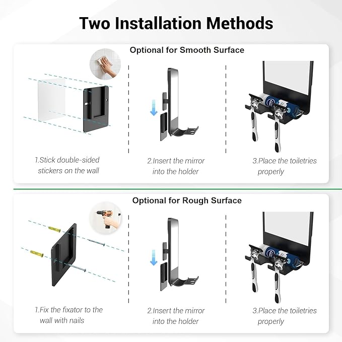 - 【Two installation methods for fogless shower mirror】: 1) Suitable for solid adhesive installation: smooth and flat surfaces, such as glass, smooth tiles, etc. 2) Suitable for screw installation: rough and uneven surfaces, such as lime walls, wooden walls, cement walls, etc.