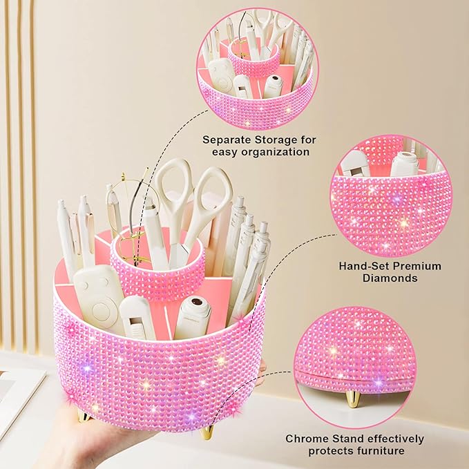 Diesisa Bling Diamond 360° Makeup Brush Holder Organizer, Rotating Makeup Brush Organizer,5 Slot Make up Brushes Cup for Cosmetics, Vanity Desktop Organizer, Gift for Women Teen Girls- Diamond Pink