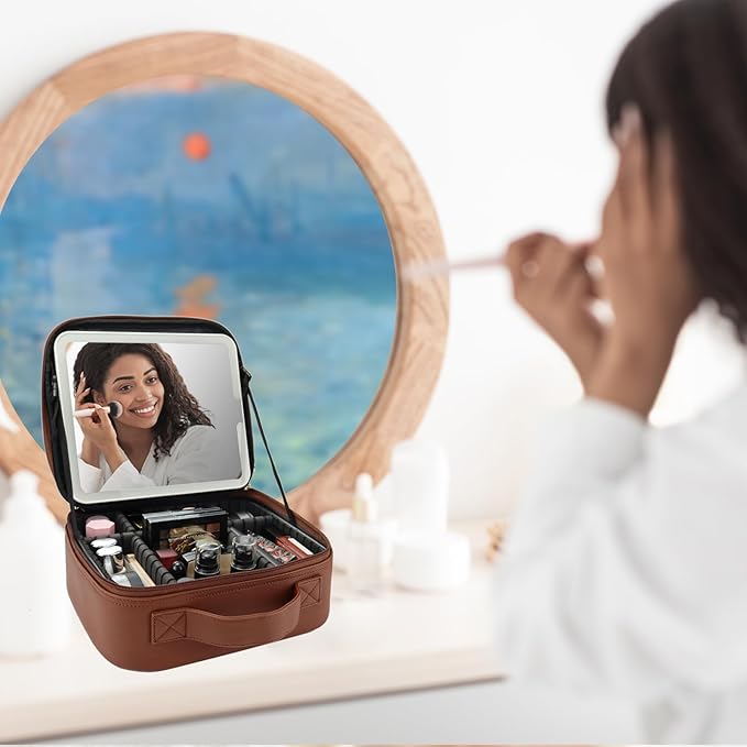 Travel Makeup Bag with LED Mirror Travel Makeup Organizer with 3 Lighted Settings, Adjustable Dividers and Makeup Brush Storage Bag Dark Brown