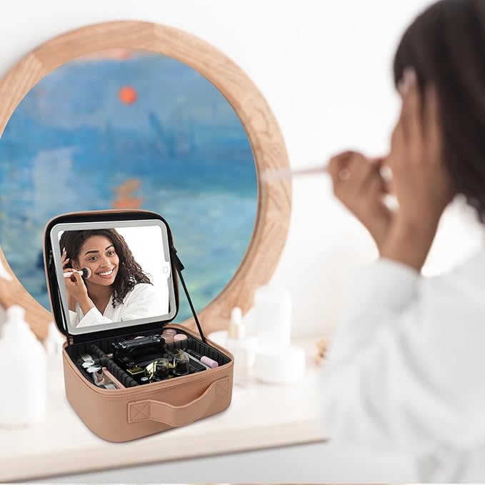 - 【Three-Color Light Source】The travel makeup organizer comes with a 9.05*7.87 inch makeup mirror. Makeup LED mirror has 3 lighting modes, short press can switch between white light, warm light, natural light, simulate the makeup under different lighting environment, show the real skin and face details. Long press to adjust the brightness of the LED fill light (0-100%).