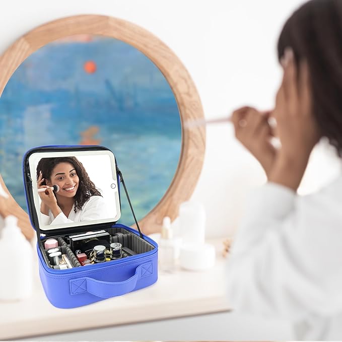 Travel Makeup Bag with LED Mirror Travel Makeup Organizer with 3 Lighted Settings, Adjustable Dividers and Makeup Brush Storage Bag Dark Blue