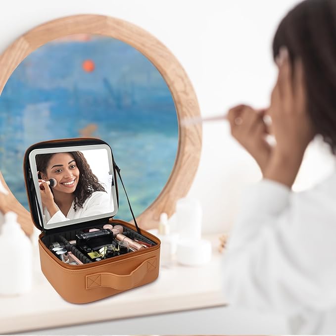 Travel Makeup Bag with LED Mirror Travel Makeup Organizer with 3 Lighted Settings, Adjustable Dividers and Makeup Brush Storage Bag Orange-Brown