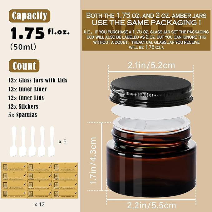- Premium Quality & Wide Usage --Package include 12 pack 1.75 oz amber round glass jars with 12 black metal lids, 12 inner lids with handles,12 inner liners,5 spatulas and 12 lables,Amber glass jars use high-quality glass,For storing cosmetics, DIY body butter, DIY lotions, face creams, bath salts, lotions, Essential oils, Candles,Ointments,trinkets, sugar scrubs, and salt scrubs. Our round glass jar is great for sharing with your friends and family, sharing your care with them.