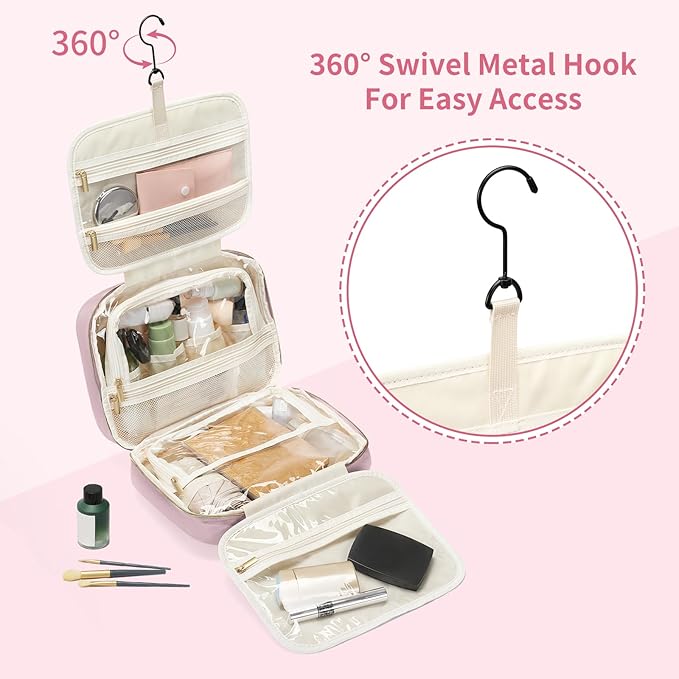 - Hanging Design: Our makeup organizer bag can stow-away 360-degree swivel non-slip metal hook for versatile hanging options; cosmetic bag carry handle doubles as its hanging strap; two-way zipper closure for quick access