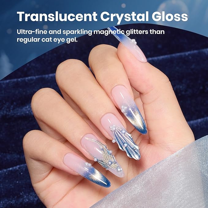 - 【Warm Tips】Please conduct a skin test before use with blue cat eye glitter gel nail polish. Professionally formulated and only used for nails.Stop using the product if redness and itching developTips: Gently shake well before use—especially for metallic, glitter, and cat eye gel nail polish—to evenly mix natural settling of pigment particles.