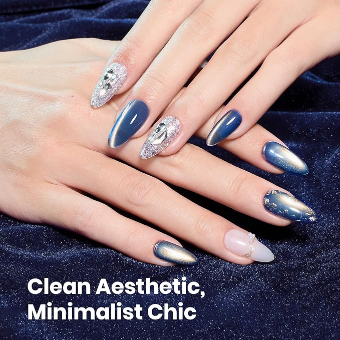- 【Frosted Sapphire Fall Cat Eye Gel】Shine like the stars with this icy blue cat eye gel polish. Its cool undertone naturally brightens any skin tone, while gold powder create a luminous, glassy finish. Inspired by the night sky, it delivers a flowing galaxy effect that's perfect for dreamy, futuristic, or elegant evening looks.