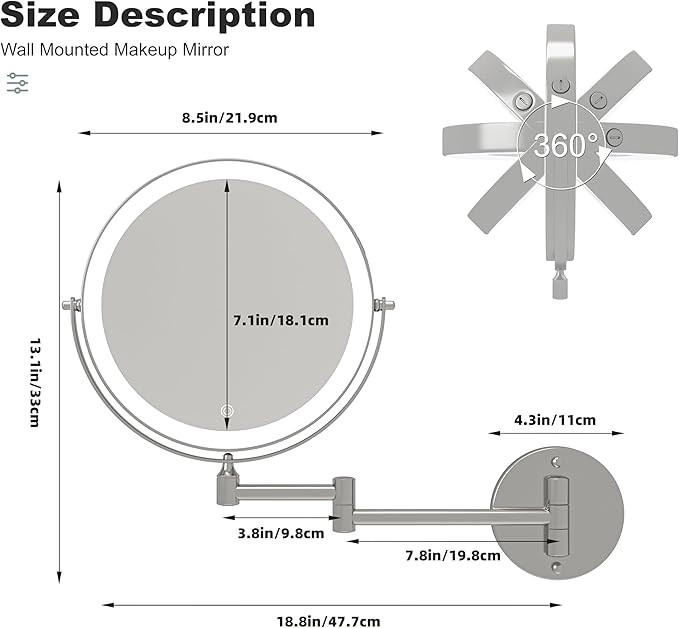 - ๐ซ๐๐ฑ๐ญ๐๐ง๐๐๐๐ฅ๐ ๐๐ซ๐ฆ ๐ฐ๐ข๐ญ๐ก ๐๐๐-๐๐๐ ๐ซ๐๐ ๐๐จ๐ญ๐๐ญ๐ข๐จ๐ง: The extendable arm reaches up to 18.8 inches, allowing you to position the mirror at the perfect angle for your routine. The swivel mirror rotates 360 degrees, offering a full range of motion to find your ideal viewing angle. When you're done, you can fold it back against the wall to save space. This versatility makes it ideal for any bathroom or vanity setup.