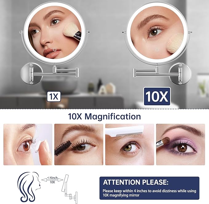 - ๐๐๐ฎ๐๐ฅ-๐๐ข๐๐๐ ๐๐๐ ๐ง๐ข๐๐ข๐๐๐ญ๐ข๐จ๐ง ๐๐จ๐ซ ๐๐ซ๐๐๐ข๐ฌ๐ข๐จ๐ง: The bathroom mirror for wall offers both 1X and 10X magnification. The 1X side is great for general makeup application and hairstyling, while the 10X side is perfect for precise tasks like applying eyeliner or tweezing. To avoid dizziness, keep your face within 6 inches of the 10X magnifying mirror. This dual-sided design gives you flexibility for both detailed work and broader views.