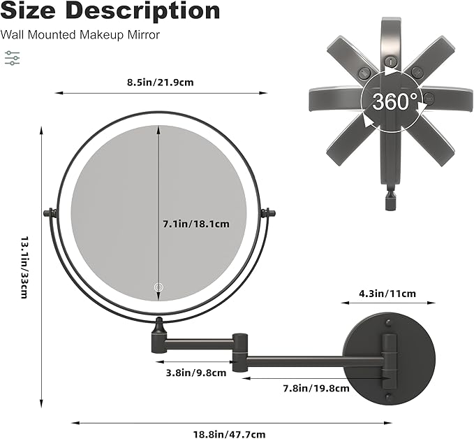 - ๐ซ๐๐ฑ๐ญ๐๐ง๐๐๐๐ฅ๐ ๐๐ซ๐ฆ ๐ฐ๐ข๐ญ๐ก ๐๐๐-๐๐๐ ๐ซ๐๐ ๐๐จ๐ญ๐๐ญ๐ข๐จ๐ง: The extendable arm reaches up to 18.8 inches, allowing you to position the mirror at the perfect angle for your routine. The swivel mirror rotates 360 degrees, offering a full range of motion to find your ideal viewing angle. When you're done, you can fold it back against the wall to save space. This versatility makes it ideal for any bathroom or vanity setup.