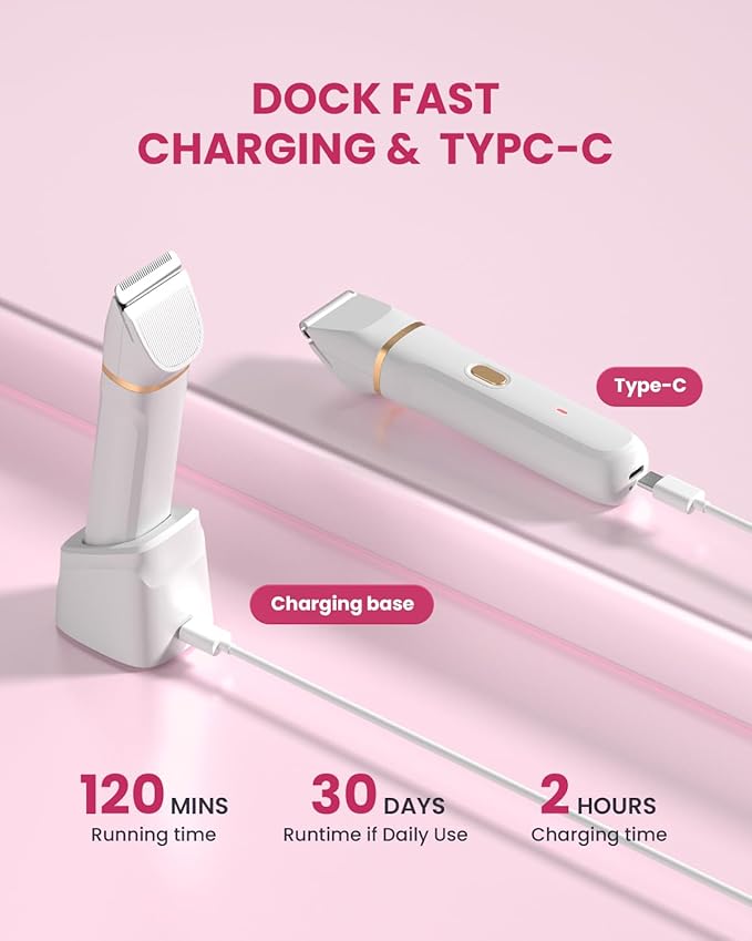 - 【Long-Lasting Battery】Our pubic hair trimmer is rechargeable and comes with a USB cable, carrying bag and wireless charging stand.The high-performance lithium battery provides longer life , bikini trimmer runs up to 90 minutes on 1.5 hours charge. Let’s enjoy extra portability with our lightweight trimmer