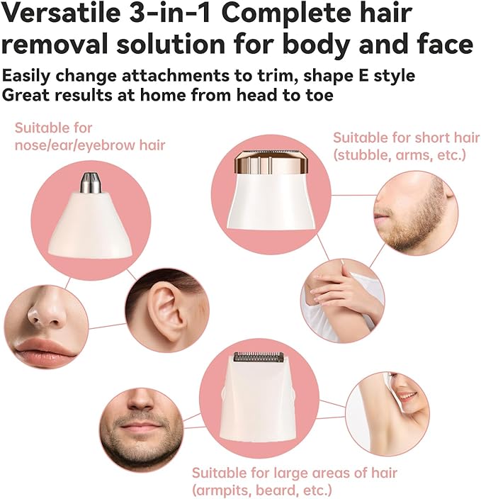 - Versatile 3-in-1 Trimmer: The all-in-one hair trimmer is designed for those who need to remove hair from multiple areas without the hassle of buying multiple devices. It comes with three interchangeable trimming heads: a facial hair trimmer, a nose hair trimmer, and a body hair trimmer. Effortlessly remove unwanted hair from the bikini area, arms, underarms, legs, and other body parts, as well as quickly tackle lip hair, chin hair, cheek fuzz, and nose hair