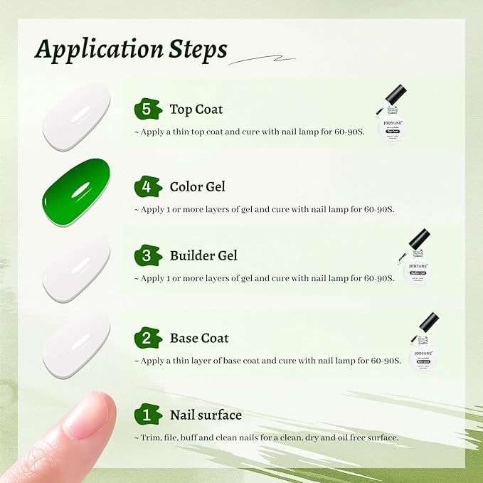 - What You Will Receive: JODSONE 3Pcs 10ml Top Coat, Base Coat, and Builder Gel Set. The base coat protects your natural nails, the builder gel strengthens and extends nails, and the top coat provides a high-gloss, long-lasting finish.