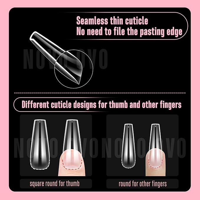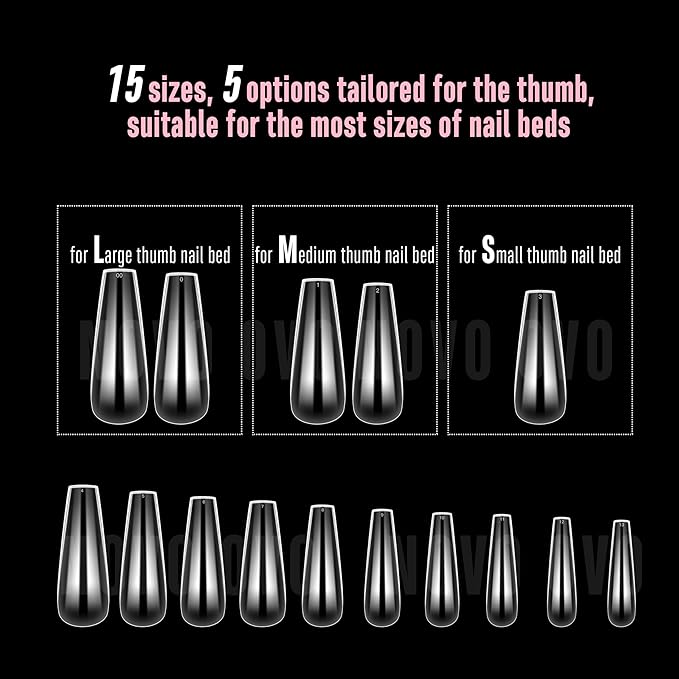 NOVO OVO Long Coffin Nail Tips NATURAL (Not SCULPTED) for Flat Nail Beds, Extra Thick L Length False Nails Press on, Full Cover Soft Gel Fake Nail Extension, Salon DIY x 15 Sizes 450 pcs