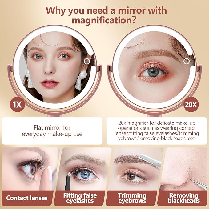 - Dual Side 1x/20x Magnifying Lighted Mirror: This magnifying makeup mirror comes with 1X and 20X mirror, the 1X is suitable for daily use and the 20x magnifying mirror is suitable for delicate operations such as eyelash plucking, eye lash installation, wearing contact lenses,and removing blackheads, it's not only suitable for young women, but also the first choice of makeup mirrors for seniors and cataract patients